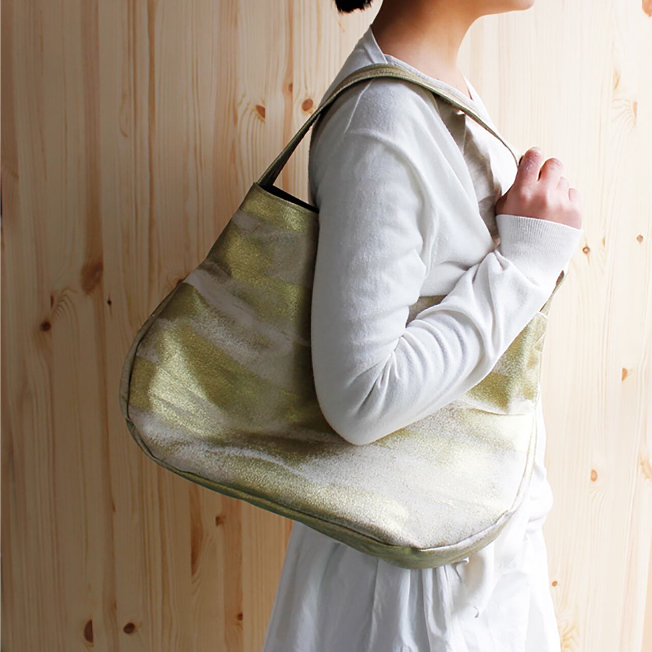 金彩友禅染・8号帆布ワンショルダーです。 荷物がそんなに多くなくていい時のお出かけに程よいサイズ感です。 ゴールドを刷毛染め後・縫製しています。